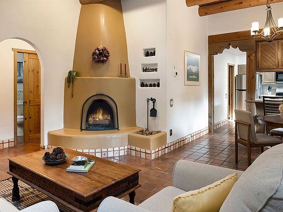 Rare single-level, 2-bedroom, 2-bath Santa Fe–style condo in the highly sought-after Griffin Park Condo community—just a few blocks from the Plaza. This charming home features classic Santa Fe details including a front portal with Latillas, Vigas, Saltillo tile floors and two Kiva wood burning fireplaces. In September 2025, the seller added a built in wine refrigerator and a stainless steel Frigidaire appliance package that included a stove, refrigerator and dishwasher. The kitchen has a bar seating and the pantry/laundry room connects directly to the attached single car garage for easy access and extra storage. The spacious primary suite offers a large closet and its own fireplace with French doors that open to the private courtyard under a canopy of trees. Modern comforts include central heating and air, tankless water heater and full-size washer and dryer. HOA covers water, sewer, trash, roof, stucco, and exterior landscaping. Quiet end-unit location on a peaceful street—ideal as a primary residence, pied-à-terre, or investment.