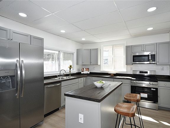 Discover this stunning 5-bedroom, 3 full bath home that has been completely renovated and thoughtfully reimagined from a duplex into a spacious single-family residence. Perfect for modern living, this home offers two primary suites—one on the main level and one upstairs—each with its own private bathroom, providing comfort and flexibility for multi-generational living or hosting guests. The heart of the home is the expansive kitchen, designed to impress with white shaker cabinets, sleek granite countertops, a large butcher block island, and all brand-new appliances. Each bathroom has been beautifully updated with ceramic tile surrounds and stylish new vanities. Situated on a double lot, the property features a large yard, ideal for entertaining, gardening, or play, along with ample off-street parking. With every detail refreshed and modernized, this home is truly move-in ready—blending style, space, and convenience in one incredible package.