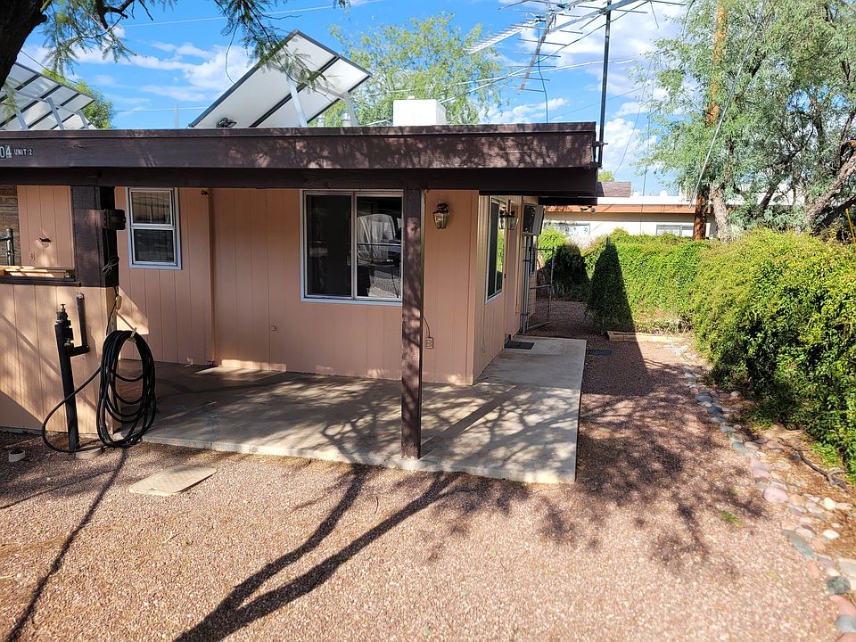 We are renting this refurbished duplex apartment which includes a 6X7' outdoor shed. Flat rate of $200 monthly for utilities: gas, electric, water, sewer and garbage. This is a very private, secure, well maintained apartment with owners in the other half of the duplex. It is back off the street with a gated driveway, off-street parking, and has private fenced front and back yards, yet is still within the Tucson city limits. It is wired for cox cable and is hooked up to a solar backup power system. It has a heat pump to provide heating and air conditioning, and 1 bath with a large shower. There is a lot of storage space inside, with a large pantry, and large bedroom closet and other storage shelves in the bathroom. Laundry hookups are on the porch for a washer and an electric dryer and a clothes line in the rear yard is also available. The kitchen has lots of cabinets and a long counter top, a gas stove, full size refrigerator, and dishwasher. It has all ceramic tile floors and new window coverings. No smoking, vaping, candles, or incense is allowed inside the apartment. We prefer no pets, but if one is allowed, it must be preapproved and requires an additional non-refundable pet deposit of $250 per pet. The apartment is close to bus lines and the Tucson Mall and convenient to almost any type of store needed. We require a lease agreement for 1 year minimum with an $950 security/cleaning deposit and $200 redecorating charge.