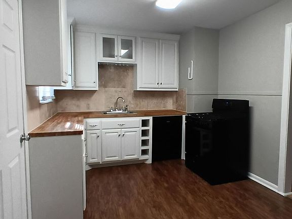 Remodeled kitchen with butcher block counters, nice cabinetry,