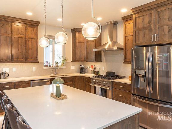 Gorgeous move in ready home close to greenbelt, schools, an off-leash dog park, and shopping. The modern, open floor plan features soaring ceilings, oversized doors, large windows, and a gas fireplace. The kitchen is built for a chef, with quartz countertops and an oversized island, upgraded stainless steel appliances, and custom cabinetry. The main level master suite offers patio access, a soaker tub, a tiled walk-in shower, heated floors, and a roomy walk-in closet. The yard is fully fenced with a large covered patio and no back neighbors. Garage features custom built storage shelves and workbench.