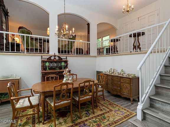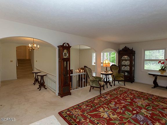 This charming, tri-level home is situated in a beautiful, forest-like setting on more than an acre-and-a-half lot on a quiet street just minutes from the heart of historic Carthage. Enter through the Carolina room in back with window walls overlooking the a large brick patio and tranquil property. It opens into a family room with fireplace, kitchen with wood-stain cabinetry, granite countertops and stainless-steel appliances, breakfast area, and hall with a full bathroom, laundry room, rec/bedroom and access to the basement. Step from the breakfast area to a formal dining room with soaring two-story ceiling, open to the foyer and living room above with white railing and arched openings into the living room, elegant chandelier, sliding glass doors opening to the patio and two high picture windows allowing lots of natura light to pour in. The main level has LVP flooring throughout. Steps from the dining room lead up to the foyer and spacious living room on the middle level. The third level includes the primary bedroom suite which has a sitting room with a wide arched entry and walk-in closet, two bedrooms and full bath. A partial unfinished basement has a great workshop area and lots of storage space. The home is surrounded by mature pines, hardwoods and landscaping in the curve of the street, providing lots of privacy. New roof installed April 2023 with transferrable warranty. Buyer has 60 days from closing date to transfer warranty into their name.