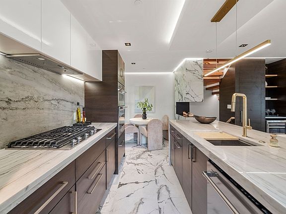 Discover the Allure of Modern Carriage House S°-Nestled in The Elliot Estate, the modern designed interior complements the beautiful Victorian exterior w/charming cupola. 4 bed, 2+ bath. Boasting 4 levels of incredible living space w/open concept kitchen w/stone waterfall countertops, double ovens, wine bar & beverage station. Stunning floating stairway, 3-sided fireplace, beautiful hdwd floors enhance the master level & stairs w/tile on the entertaining level. Impressive Master Suite w/cathedral ceilings, walk-in closet & luxurious spa-inspired bath w/radiant tile floors, soaking tub, bidet & walk in shower w/6 body sprays, rain head & waterfall. Lovely sitting area w/beautiful natural light provides a peaceful space. 4th level loft to cupola w/360 degree views. Versatile adaptability room design on garden level opens to a lovely stone terrace. Private entries, deeded pkg, smart technology & accessory separate space as finished studio/office/aupair/in-law/rental inc. opt. above garage