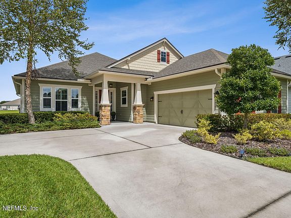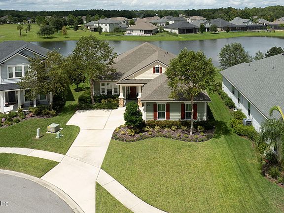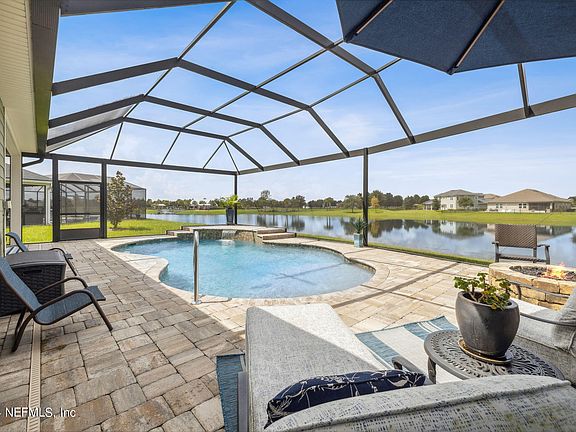 Exquisitely designed for comfort and beauty, this pristine pool home on a premium lakefront lot, blends energy-efficient features with a relaxed, modern lifestyle in the sought-after Gran Lake community within the World Golf Village region. With its high ceilings, decorative crown molding, custom chandeliers, and abundant natural light, the home's open floor plan encompasses four bedrooms and three bathrooms, highlighted by an elegant, coffered ceiling in the living room, automated shades on the sliding door, tile flooring, and plantation shutters throughout. The well-appointed gourmet kitchen, complete with a gas range, and a solid surface center island, flows seamlessly into the living and dining spaces, offering breathtaking views of the paver screened-in lanai, fire pit, a heated saltwater pool (2021) and picturesque sunsets over the lake. The owner's suite is your private oasis boasting a spa-like bath, and a spacious walk-in closet with convenient laundry room access. A spacious courtyard entry 2-car garage has been upgraded with Shark coating floors. Additional upgrades include HVAC with air purifier (ozone), reverse osmosis Kitchen sink, faucets, finishes, water softener, Gutters/downspouts, and so much more. This natural gas community has no CDD Fees and is zoned for top-rated schools in St Johns County. Residents of Gran Lake can take advantage of amenities including the Lake House, pool, kayak launch, playground, and ample green space. Enjoy an active lifestyle surrounded by the beauty of nature and luxurious living in this beautiful home. Call for your private showing.
