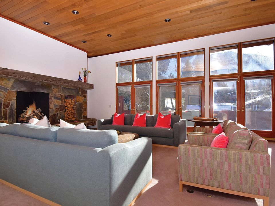 Springs side of Bald Mountain, with high ceilings and an elegant gathering area with gas fireplace. Ideal for entertaining or cozy evening in. The kitchen, dining room (with custom-built table for eight), and
