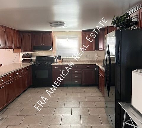 Metal roofOption patioKitchen features black appliancesDark cabinetry