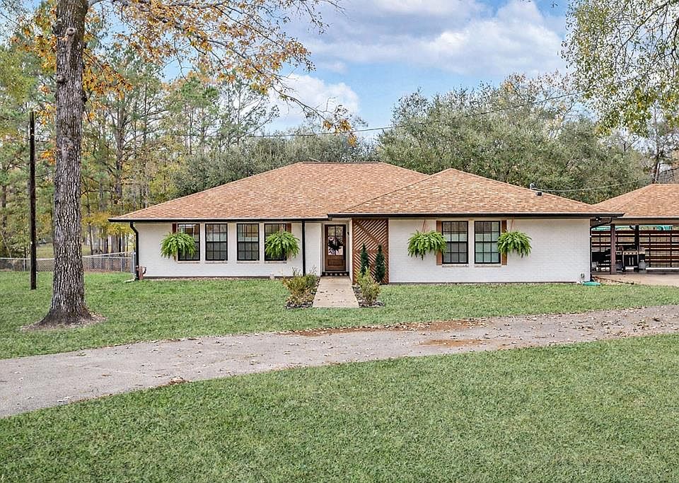 This modern, brick, single-level home is a true homesteader's dream! Fully remodeled in 2024, it offers peace of mind with new windows, HVAC, well pump, updated electrical, & more—Enjoy low-maintenance living for many years to come. Inside, enjoy cathedral ceilings, a fireplace, & custom Santa Fe hand-textured walls. The spacious kitchen features abundant counter space, a breakfast bar, multiple pantries, plus upgrades like a pot filler & pop-up outlets. The 4th bedroom offers flexibility as a second primary suite or bonus room. The fenced pastured acreage features a large barn with power & water, animal corrals, & a chicken coop. A brand-new 2530 shop with 10' roll-up doors is perfect for equipment & toys. Located on a quiet no-thru street with a circle drive for easy trailer access & parking. Just 7 minutes to Lake Sam Rayburn boat launches. A 14-passenger tritoon boat & zero-turn mower can be included for agreed upon price.