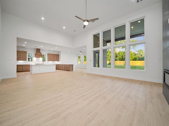 Revwood flooringHuge covered patioTable top islandBacking to woodsSeamless silestone backsplashSoaring ceilingsKitchenaid prof series apps