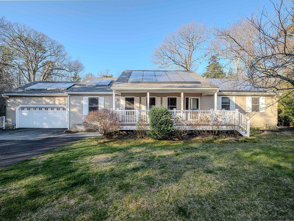 Beautifully updated 3 BR, 2.5 BA Ranch situated on over 1 acre in a very desirable neighborhood. The covered front porch welcomes you to this very well maintained home. The gorgeous eat-in kitchen has stainless steel appliances, granite countertops and wet bar/coffee counter. Spacious dining room, living room with spiral staircase to bonus loft which overlooks the family room. The sun soaked family room boasts a vaulted ceiling and skylights with sliders to large composite deck with retractable awning and above ground pool. Lovely tile floors throughout, primary bedroom with ample closets and full bathroom with walk-in tile shower. There is plenty of storage in this home with an oversized garage too. Relax on the front porch in this lushly landscaped setting or entertain guests on the expansive rear deck. Call today to see for yourself! Property is an estate and is being sold "As Is."