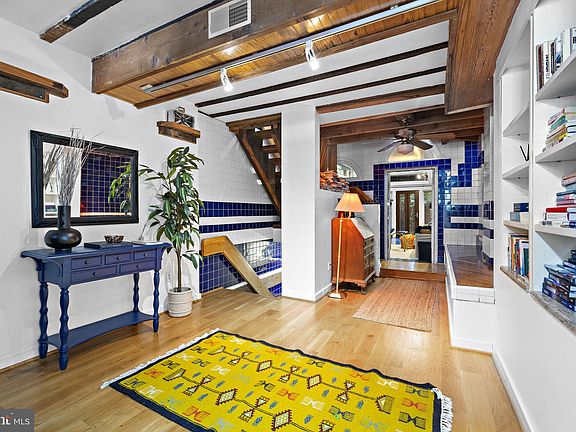 Built in 1850 and lovingly updated over the past 50 years by its longtime previous owner, architect John Savage, this home seamlessly blends historic charm with thoughtful modern design. The main level has a living room, half bath and familyroom/study with cozy wood stove. Out the back doors is a charming brick patio for entertaining or relaxing privately. Upstairs you’ll find wood floors running through the two bedrooms, each one with its own private bath. Multiple skylights flood the space with natural light On the lower level, a spacious dining and family area connects to a contemporary kitchen outfitted with sleek stainless steel and marble countertops. The laundry area is conveniently tucked away on this level as well. Throughout the home, intriguing architectural details and rich wood & stone tiles create a warm and distinctive atmosphere. Unique uses of tile, marble and wood add visual depth, while gracefully rounded openings lend a touch of artistry and fascination to the space. Many built in shelves, closets and the attic provide ample storage space. Marvelous location; walkable to downtown Old Town, King Street and the waterfront. Quick access to the GWParkway, Rt. 1 & I495. This home has been consistently successful as a short-term rental.
