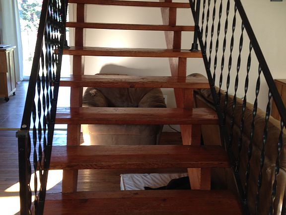 Larger than appears. Spacious. Large liv.rm.& separate din.rm. Island kitchen-lots of cabinets. Unique floating staircase to upper level. Master bed & second bed & bath upper .Main level nice size bed & full bath Many nice upgrades/ Roof, windows, countertops, floors, large shed much more. Fenced yard. Walk schools & restaurants.