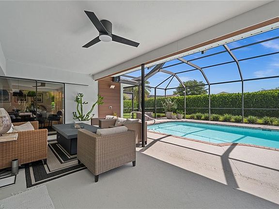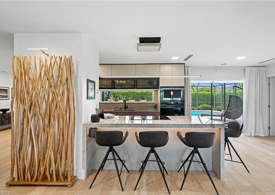 COMPLETELY REMODELED 2021. RESIDENCE COMES TASTEFULLY FURNISHED WITH LUXURIOUS , HIGH-END FURNITURE, CREATING AN ELEGANT AND MOVE-IN READY LIVING SPACE. THIS STUNNING 3-bedroom home offers EXEPTIONAL QUALITY and one-of-a-kind contemporary design. Every detail has been thoughtfully curated, from the open-concept floor plan to the imported natural stone accents from Brazil. The kitchen features a spacious island, a rare backsplash window that creates beautiful light effects, a bar area with dramatic backlit stone, and premium appliances including a smart Whirlpool oven, built-in Fisher & Paykel coffee machine, Bosch dishwasher, and smart Samsung washer/dryer. The luxurious primary suite boasts an open California-style lighted closet concept, while the home’s smart features enhance comfort and convenience throughout. Step outside to a large swimming pool and expansive outdoor living area, fully enclosed with lush privacy landscaping. LOCATED just 3 miles from 5th Avenue South, this home combines style, location, and LOW HOA fees—perfect for those seeking something truly unique and move-in ready. ROOF WITH DOUBLE INSULATION- 2021,WINDOWS-2022 WITH ASTRO GUARD HURRACAINE PROTECTION-HVAC-2021, ALL ELECTRIC, PUMBING AND DRYWALL 2021, POOL HEATER AND POMP 2023. ALL WORK PERMITED AND INSPECTED. A true Naples gem that must be seen to be appreciated!