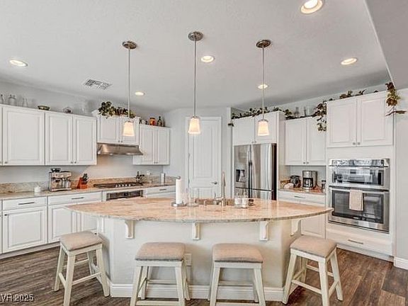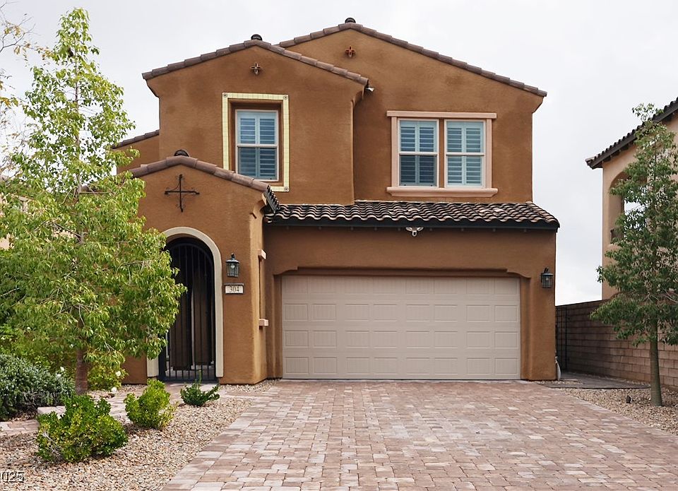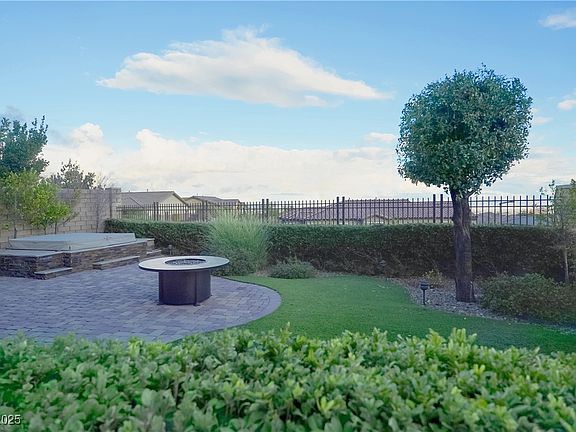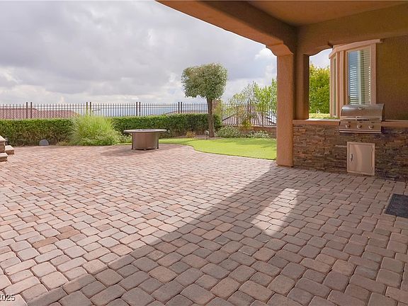 OUTSTANDING STRIP VIEWS from both the ground-level backyard and the covered balcony! This home features an extended paver driveway leading to a spacious courtyard with a beautiful fountain. A downstairs office/gym includes double doors opening to the courtyard. Enjoy commercial-grade Wi-Fi with pre-wired Unifi networking, plus built-in ceiling speakers throughout B&W speakers on the first floor and upgraded KEF ceiling speakers on the second floor. The upstairs boasts a professional home-theater setup with Strip views. The home includes a downstairs guest suite with a full bath, a gourmet kitchen package with upgraded white cabinetry, and granite counters. The great room off the kitchen features stacked sliding doors that open to the back patio, along with built-in cabinets. High-end light fixtures and window coverings are installed throughout. Located in the sought-after Summerlin area within a highly rated school district. More photos coming soon. NO SHOWINGS UNTIL December 1, 2025