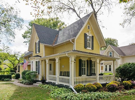 Beautiful and Spacious Historic Farmhouse with 4 beds and 2.5 baths. Newly refinished hardwood floors throughout the first floor, new carpet upstairs, freshly painted. Formal Living room with French Doors, Huge dining room with Bay windows and a charming window seat. Wood burning fireplace in the family room with a second staircase. Bright eat-in kitchen with all stainless steel appliances and classic cabinetry with glass fronts, Parlor leading to a private brick patio with hot tub. First floor laundry room. Some additional unique features are stained glass windows, original built-ins, Walk-in closet and laundry shoot in the master, claw foot tub, wrap-around front porch, antique brick walkway leading to the cozy side porch, flagstone walkway and a crushed granite driveway. Close to everything and just a short walk to schools, churches, parks, fox river and bike trail, restaurants and shopping. Nestled in charming neighborhood featured by Good Morning America as Best Block in America!