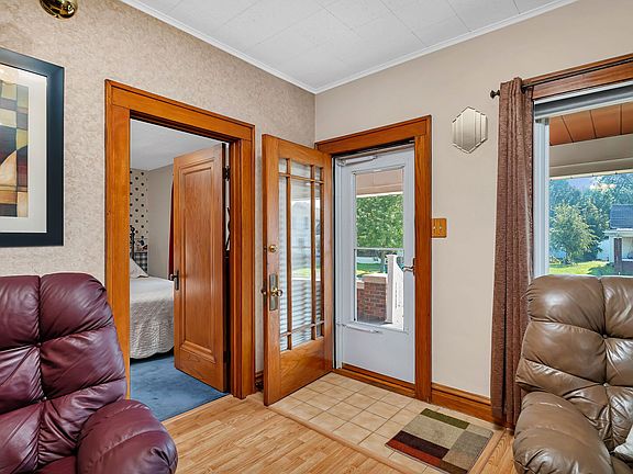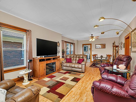Welcome to this absolutely adorable brick bungalow, full of charm and stylish updates! A cozy front porch invites you in, perfect for morning coffee or evening chats. Step inside to a bright and airy living room with a seamless dining room combo-ideal for everyday living and entertaining. The cheerful kitchen shines with gorgeous original stained cabinets, ample counter space, and natural light that makes it a joy to cook in. The updated main floor bathroom features a sleek tile shower, granite countertops, and a newer vanity for a modern touch. With two comfortable bedrooms on the main floor and a spacious attic flex room perfect for a home office, playroom, or guest space, this home adapts to your lifestyle. The finished basement offers a large recreational room, an additional full bathroom, and plenty of storage. Outside, enjoy the deck with a retractable awning for shade on sunny days, plus a lovely patio-ideal for relaxing or hosting friends. A single-car garage adds convenience and a 15'x10' shed adds extra storage. This delightful home blends classic charm with thoughtful updates-come fall in love! New roof and garbage disposal in 2025, updated kitchen and new dishwasher in 2024, bathroom remodeled in 2020 and newer vinyl windows throughout and new garage door with remote control.