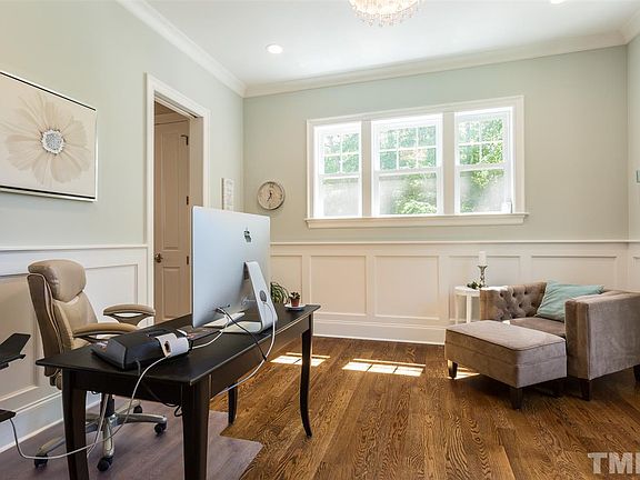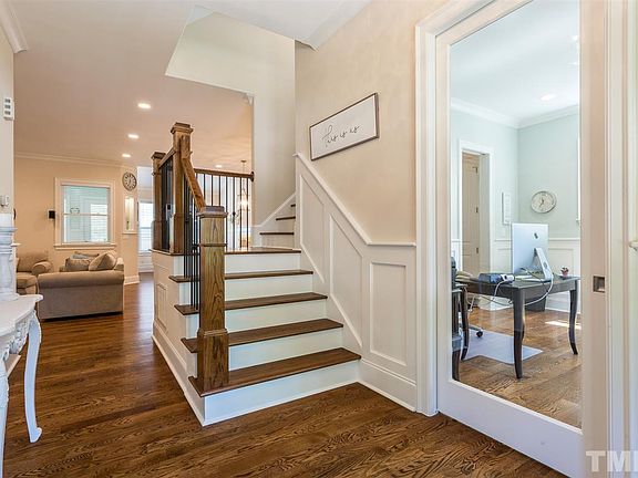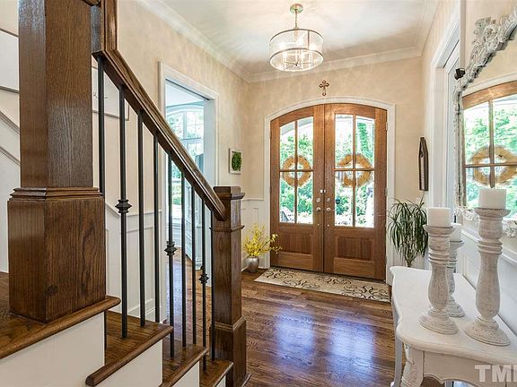 In the heart of Historic Downtown Apex, this 5 BR 6 BA home built by Rochester Contracting Network will immediately impress you! 10 ft ceilings on main floor, site finished hardwoods, gorgeous pocket doors, custom built ins and window seats throughout. Gourmet kitchen to include 6x9 island, stacked cabinets, walk in pantry, Artisan style hood, range & wall oven. Luxury master bath w/ rain glass doors, his/her vanities, soaking tub & custom shower. Guest suite w/ kitchenette, laundry & private entrance.