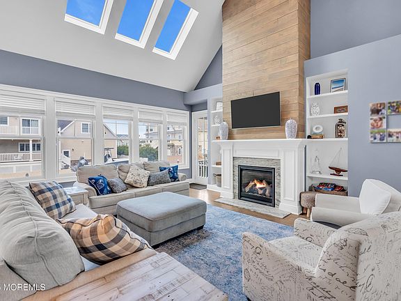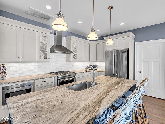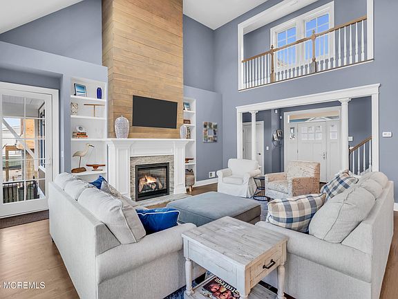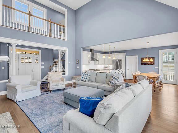 MANTOLOKING SHORES - Stunning custom-built lagoon front home offers 4 bedrooms, 3 full bathrooms & boasts an open floor plan perfect for entertaining that includes a great room w/vaulted ceilings & gas fireplace, dining area, & high-end chef's kitchen w/granite counter tops & pantry. Additional interior features include large primary bedroom w/en-suite full bathroom, walk-in closet, & private balcony, an upstairs rec room w/balcony, upstairs laundry room, & two ground level bedrooms. The maintenance free exterior includes a large back deck w/ inground heated pool overlooking a deep-water lagoon, vinyl bulkhead, outside shower, oversized garage & paver driveway.