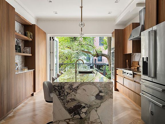 The gourmet kitchen is a true showpiece, designed for both function and flair. The back wall has been completely reimagined to create a seamless indoor-outdoor living experience. A fully retractable accordion-style glass door opens onto a private deck, allowing natural light to flood the space and offering effortless flow for al fresco dining and entertaining. The kitchen itself boasts a Calacatta Viola honed Italian marble countertop, walnut veneer cabinetry, and unlacquered brass fixtures, creating a refined and contemporary finish.