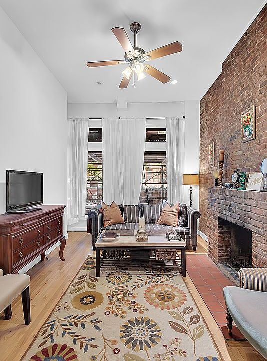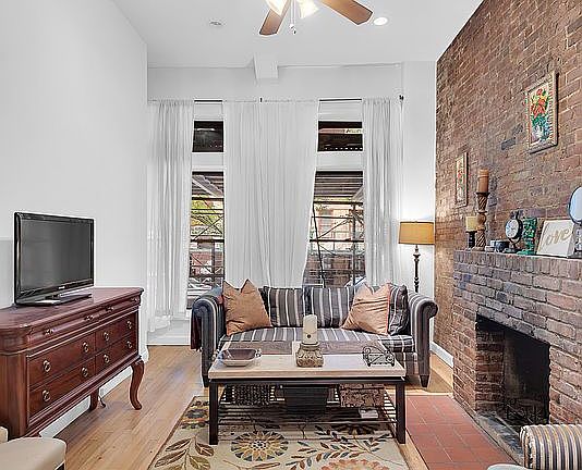 Exposed brick wallsPeaceful tree-lined blockSoaring ceilingsStainless steel appliancesWood-burning fireplaceThoughtfully designed kitchenAdditional storage