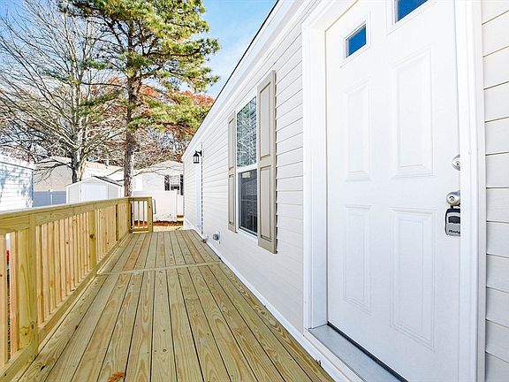 Located at 3040 Cranberry Hwy U:32, East Wareham, Garden Homes Estates East. The heart of this home is undoubtedly the kitchen, featuring shaker cabinets adorned with crown molding, creating an attractive space to craft delicious meals. Imagine preparing your favorite recipes here, with ample storage and a design that blends functionality with classic style. The bedroom is enhanced by crown molding, lending an air of refinement to your personal retreat. Picture relaxing in this comfortable setting, where the architectural detail adds a touch of sophistication to your everyday living. This property offers the convenience of a laundry room, a deck for enjoying the outdoors, and the practical benefit of a shed. The open floor plan enhances the living space, creating a welcoming atmosphere. This 624 square feet mobile home, built in 2025, offers two bedrooms and one full bathroom. The current $525 monthly fee includes, taxes, septic, water, snow removal park roads, trash, lot/land lease.