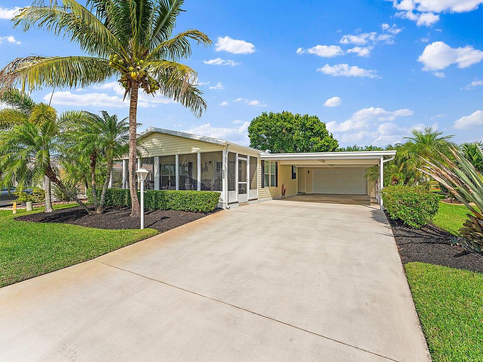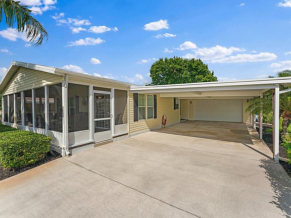 Welcome to Florida retirement in this beautiful Islander III model. Home is fully furnished and features 2 BR's, 2 BA's, and an additional den/office, or 3rd BR w/ French doors. The heart of the home is updated with a modern styled kitchen, adorned with quartz countertops and SS appliances. Primary bath has updated cabinetry, countertops, dual sinks and additional storage. Home has a 2020 roof and a 2-car gar. along with an oversized covered carport, cost saver irrigation well with updated hurricane anchors. Step out and unwind on the 27'' screened lanai or enjoy the outdoor patio with lake views. This home has it all and located in the amenity packed 55+ Savanna Club community. Land Lease Property. All measurements approximate, buyer to verify