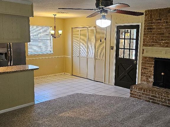 Large lotBreakfast roomNew carpetFamily room with fireplaceKitchen adjoinsStorage building in backLarge covered back porch