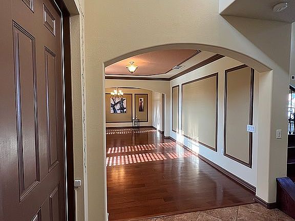 Builder model house with all upgrades and artful wall murals, crown moldings, ceiling moldings, wall moldings, windows treatment, chandeliers, central vac system, 5 inch hardwood floor and tiles in all shared spaces.