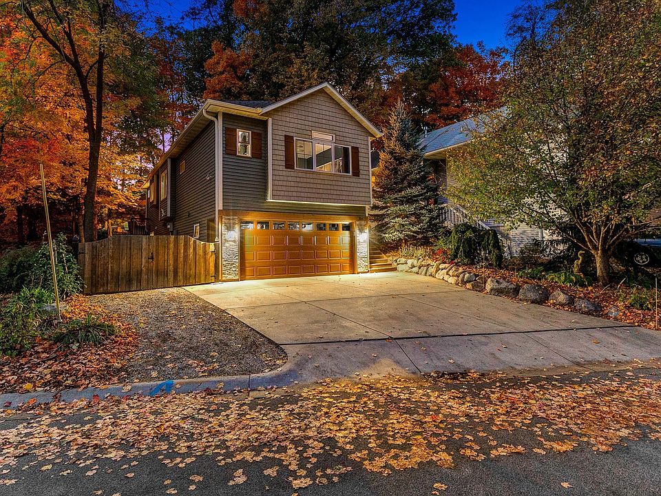 The home is essentially a reverse walk-out rambler where the lower level walks out of the front at grade and the upper-level walks out of the back at grade. The main level features 9’ ceilings with an open floorplan and all living facilities, including a beautifully renovated kitchen with custom millwork to include additional storage in the soffit and bench seating, hardwood floors, and a cozy gas fireplace with a natural stone surround. Large windows frame serene backyard nature views, while east-facing windows in the primary bedroom welcome the morning sun. A laundry closet is conveniently located near the two main level bedrooms. The lower level offers a 3rd bedroom, which is currently configured as a family room space, complete with wiring for surround sound, noise reducing insulation and an electric fireplace. Historically, homes with similar layouts in this neighborhood have advertised the lower-level room as a 3rd bedroom. It is a flexible space that can be used as a conforming bedroom, but it also works great as a family room for entertaining, relaxing, or working from home if a 3rd bedroom is not required for your family’s needs. When you enter from the tuck-under 2-car garage you immediately and conveniently encounter a mudroom area with space for a bench, hooks, a key drop, a cedar closet, and a 3/4 bathroom. Recent exterior updates include all new siding, windows (all but transoms and egress which is newer), soffit, fascia, and gutters with leaf covers. See the property fact sheet for more details on updates.