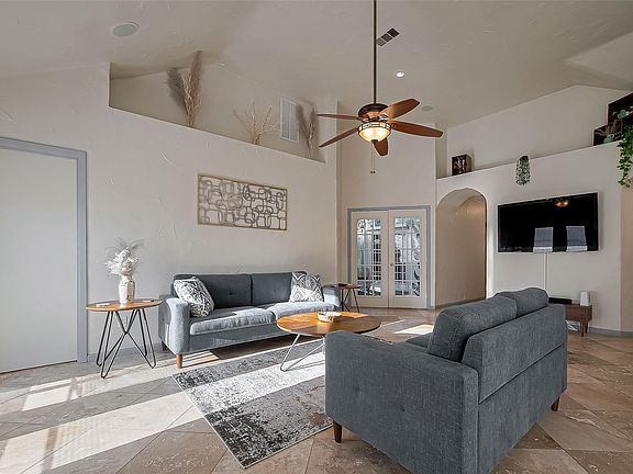 Cozy fireplaceHigh ceilingsStainless steel appliancesTravertine flooringEnclosed atriumDual-sink vanityFrench doors