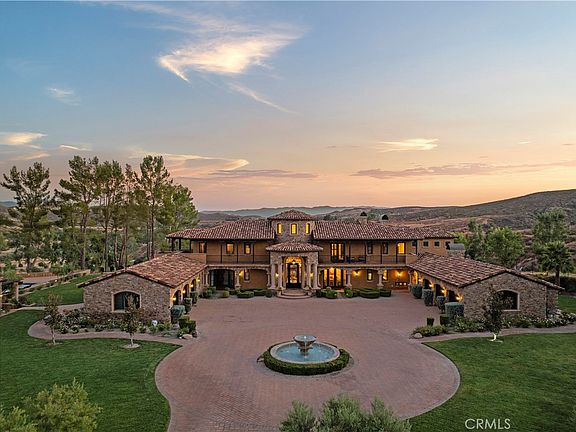 Welcome to this remarkable Mediterranean-style estate, perched atop a mountain with breathtaking valley views. A long paver stone driveway leads to a grand circular entrance, where a central fountain exudes opulence. The home's smooth stucco exterior, custom terra-cotta roof tiles, and arched entryways perfectly complement the serene surroundings. Inside, every detail is meticulously crafted, with towering columns, expansive archways, and warm natural stone creating a grand yet inviting atmosphere. A large crystal chandelier graces the soaring ceilings in the foyer, accessible through a striking metal and glass front door. This estate features 5 bedrooms, 5 full baths, 1 3/4 bath and 2 powder rooms, offering ample space. The chef's kitchen, complete with a Sub-Zero refrigerator, Dacor double oven, and 6-burner range, is both functional and stunning, featuring Inca gold slab countertops and a Walker Zanger mosaic backsplash. The family room's cozy fireplace and the great room's exposed wooden beams and bar make this home ideal for both relaxed gatherings and elegant entertaining. The formal dining room, with a wine closet and fireplace, sets the scene for sophisticated dinners. The primary suite is a private sanctuary, with a large balcony offering stunning views, a retreat with a dual-sided butterscotch onyx fireplace, and a luxurious bath with Incan gold countertops, slab-onyx mosaic backsplash, a large shower, and a jet tub. The massive closet with built-ins and windows ensures ample storage. The estate also includes a spacious basement, a separate gym, and a theater room. Upstairs, guest suites feature private baths and large balconies with views of the pool, driveway, or canyon. Outdoor living is spectacular, with a rear courtyard, water fountain, a half basketball court, and a stunning 30x60 pool with Luminar jets and color-changing lights. The pool area includes a massive spa, spillways, and a fireplace with fire bowls. The covered bar, with a horseshoe-style bar top, built-in grill, and heaters, is perfect for entertaining on cooler nights. The pool house offers a bathroom, shower, and an additional outdoor shower, ideal for rinsing off after a swim. Beautifully landscaped grounds feature lush grass, a playset, a built-in trampoline, and private gates for security and exclusivity. Close proximity to Santa Clarita with award winning schools, shops, restaurants, and the 5 & 14 freeways for commuters.