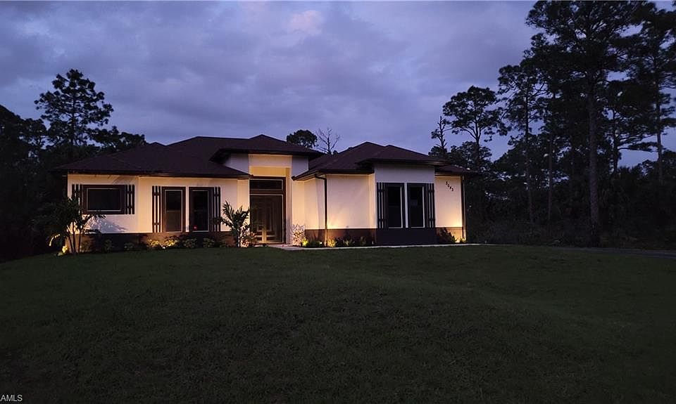 Found within the nature of Golden Gate Estates, with a warm modern barn exterior. With a great sized kitchen comes a morning bar and pantry, paired with stunning white ivory soft close cabinets and beautiful countertops, which are also fitted in bathrooms and the outdoor kitchen as well. With a split bedroom home layout comes a grand living area for everyone to gather. A den/bonus room with French doors and big enough to even be a comfortable bedroom! Through out the entire house, you will walk on Italian tiles, which are also found on the shower walls. The owner’s suite is equipped with abundant storage closets, along with two sinks in the bathroom. On the other side of the home you will find two great sized bedrooms that share a full bathroom. Each room throughout the entire house shares tall ceilings with canned lights installed in the living room, kitchen, den/office, along with the primary suite. The back patio is big enough to host a gathering or get together! The garage will comfortably fit two cars and is attached to the house. There is plenty of space and land to build or expand on the backyard! Up coming grocery stores, big bear plaza and publix is close by!