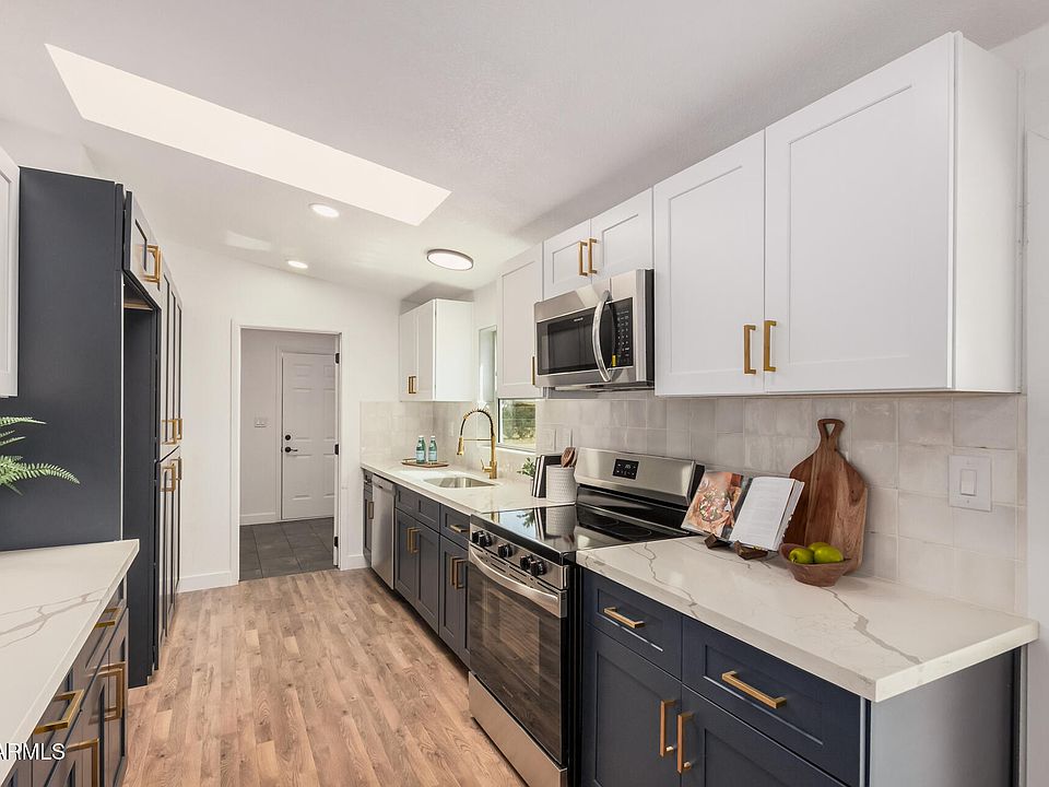 Charming manufactured home in West Phoenix Estates is now on the market! This 4-bedroom house boasts amazing mountain views & a 4-car garage. The interior showcases bright & airy living areas with tile floors, vaulted ceilings, plenty of natural light, and a neutral palette. The galley kitchen features recessed lighting, dark shaker cabinetry for abundant storage, built-in SS appliances, and convenient outdoor access. The main bedroom offers a closet and a bathroom with dual sinks & a step-in shower. The laundry room has attached cabinets for added organization. The covered patio is ideal for enjoying your morning coffee in peace & quiet. The low-care backyard is vast and ready to suit your needs. What's not to love? Come see it now!