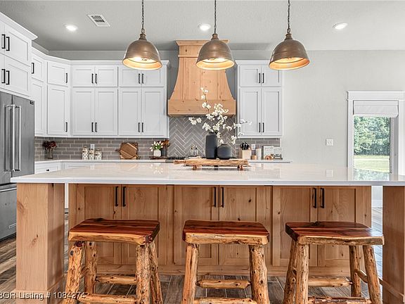 Land is fully cross-fenced, set up for horses, w/excellent pasture, riding areas & great hunting. Less than 2 yrs old, the home is foam-encapsulated for energy efficiency. Property is gated w/iron entry & located just mins from Kerr Lake & the Arkansas River, perfect for outdoor recreation.