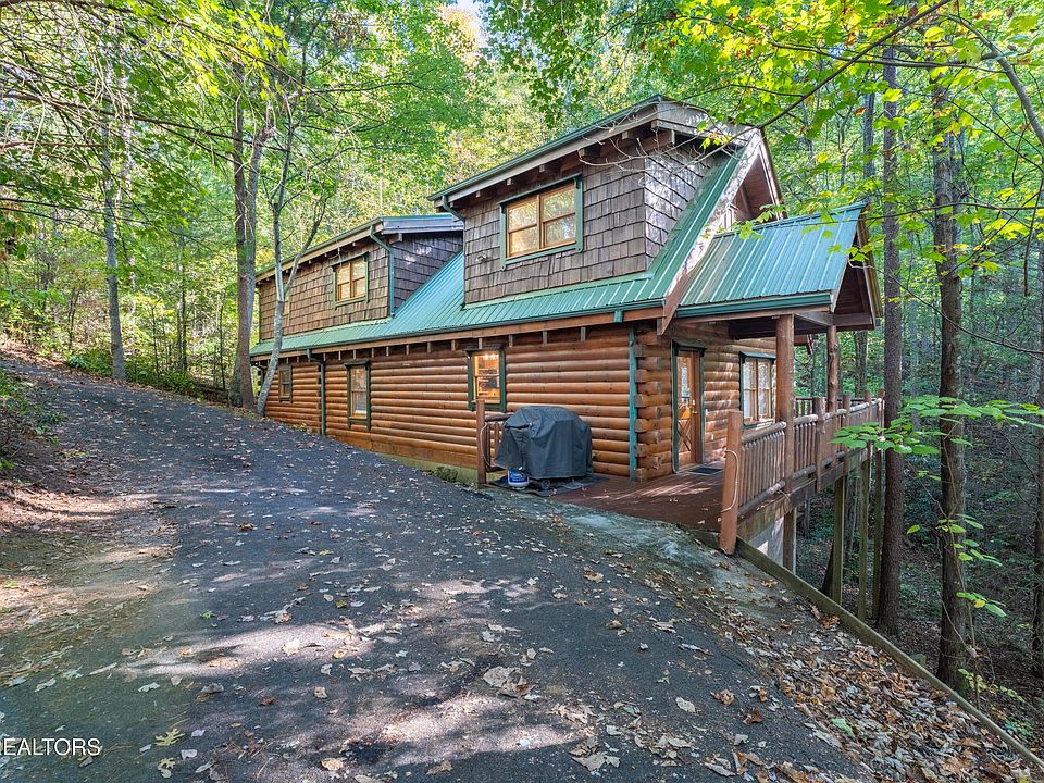 Luxury family get-away in the woods of the Smoky Mountains! This cabin, named Mountain Music by its music-loving owners, sits next to a small stream. Located in the private, gated community of Brothers Cove, this four-bedroom log cabin has two grand master bedrooms. Each master bedroom has a stone, wood-burning fireplace and a whirlpool tub, as well as a full ensuite bathroom. The remaining bedroom and bonus room with bedroom set up share a bathroom. An extra, downstairs full bathroom is available for overflow guests. The vaulted living and dining rooms open to a kitchen with granite countertops. The large, comfortable living area has a stone, wood-burning fireplace. The home features a pool table and musical keyboard, as well as a vintage Pacman arcade machine. The exterior features an extra-large covered deck with hot tub. The tri-level deck leads into the woods. This cabin has been enjoyed as an owner's retreat and overnight rental for many years and may continue as a rental or private home with management in place. Mountain music is the perfect home for serene relaxation, whether used as a primary residence, rental property or a vacation home for friends and family.