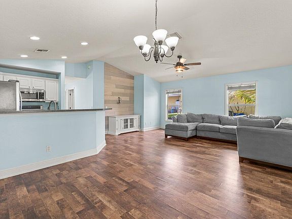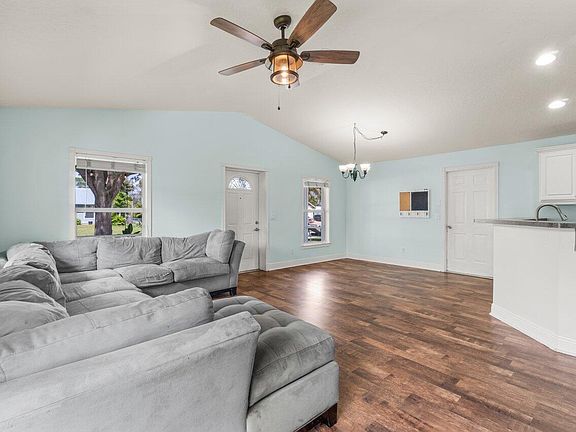 Discover this charming concrete block home with a metal roof, hurricane shutters, and a built-in transfer switch for a generator--ensuring peace of mind during storms. Located in a non-HOA community with no pet or vehicle restrictions, this home is perfect for families, investors, or those looking for an ideal vacation rental or Airbnb opportunity!Step inside to an inviting open floor plan featuring vinyl and laminate flooring throughout (no carpets!), vaulted ceilings, and a kitchen equipped with stainless steel appliances, a breakfast bar, and plenty of cabinet space. The spacious master suite boasts dual sinks, a walk-in closet, and a private retreat-like feel. Outdoor living is a dream with a lovely screened front porch and a covered back patio with extended pavers, perfect for entertaining. The large fenced backyard offers complete privacy, a treehouse, a fire pit, and lush palm-lined views. A stunning oak tree graces the front yard, while the huge extended driveway and two-car garage provide ample parking for vehicles, RVs or a boat! The yard is adorned with producing fruit trees, including mango, papaya, pineapple, coconut, and banana trees.