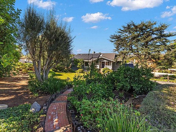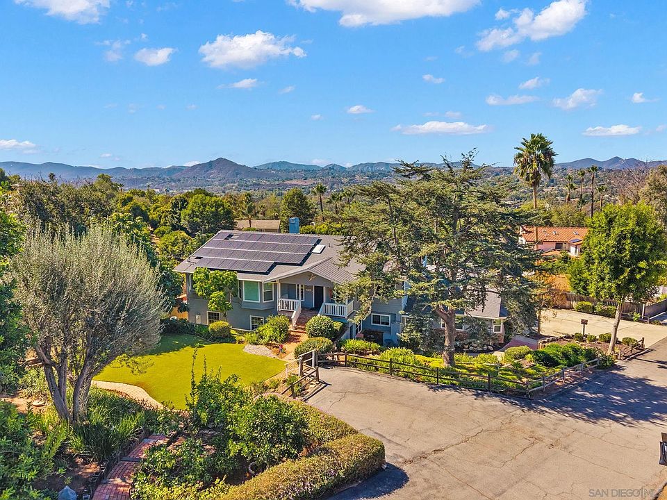 Welcome to luxury powered by 68 OWNED solar panels, including 3 Tesla power walls. Unparalleled elegance, sustainability and self-sufficiency are nestled in the hills of South Escondido delivering modern comfort while keeping operating costs remarkably low. With 5,368 sq.ft including an attached ADU, this palace is meticulously designed with living space ideal for family function & entertainment. A massive granite island highlights the open-concept kitchen which flows effortlessly into the upper-level living area where a 400+ sq. ft. covered terrace is the perfect spot to unwind with panoramic sunset views. The primary suite has striking vaulted ceilings with exposed beams, a spacious walk-in closet, and a luxurious spa-inspired bath ideal for relaxing. Additional bedrooms are thoughtfully placed on both levels. The lower level boasts a fully equipped ADU with private exterior access, a full kitchen, living room, an en-suite bath, laundry utilities, and it’s own outdoor area—ideal for generating income and/or multi-generational living. Exposure from the west side bathes the property in natural light & delivers breathtaking sunsets. The massive lot is highlighted by numerous fruit-bearing trees including Macadamia, Avocado, Pomegranate, Orange, Lemon, and more along with thriving grapevines—creating a private orchard retreat. Adding to it’s charm, the estate is home to six hens that produce over two dozen eggs weekly, enhancing the self-sustaining lifestyle. With a fully fenced & heated pool & spa, turf lawns, and a charming playhouse, this property is truly extraordinary!