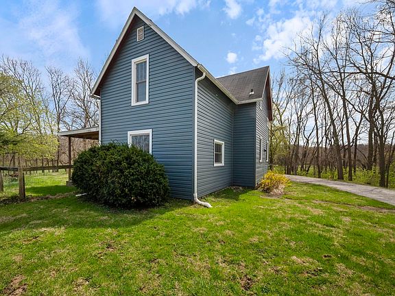 Equestrian Paradise on 21.82 Acres – A Rare Find! This stunning property blends pastoral beauty with functional equestrian amenities. Once home to a horse breeding facility and llama business, the land features rolling pasture, hayfield, wooded areas, a ravine, and scenic Burnett’s Creek making dramatic turns across the acreage. Majestic, century-old trees—Sycamore, Oak, Tulip Poplar, Walnut, and more—add rich character. Trails, including an old logging path, trace the creek and woodlands, perfect for walking or horseback riding. A serene woodland sanctuary near the highway includes a 16-ft gate (2020) and is ideal for picnics or peaceful escapes. Fenced pastures include a 3-acre field near the road, ¾-acre pasture with shed, 3.5–4-acre pasture with additional sheds, and a 3–4-acre untreated hayfield. Fencing includes horse-safe non-climb wire, classic board, and Red Brand field fencing. Paddocks surround a fully equipped horse stable built by FBI Buildings, featuring two 12x12 stalls, one 12x18 foaling stall, two pony stalls, Ritchie heated drinkers (2021), hay mow with chutes, Dutch/sliding doors, and industrial fans by Artisan Electric (2011). Security and floodlights cover all sides. The charming two-story farmhouse offers 2 bedrooms, 1 updated bath (2019), and a loft. Believed to be a Sears or Montgomery Ward catalog home, it features original wood floors and vintage 4-panel doors. A cozy woodstove supplements gas heat. The kitchen was updated in 2014 (counters, sink, appliances); new windows added in 2014, vinyl siding in 2018, and roof redone in 2001 by Loy Quinn Roofing. Wool insulation throughout enhances comfort. A detached 2-car garage includes electric openers. Well’s water tank is in the pump house behind the home. Septic system is marked by a blue bird feeder near the kitchen window, with the finger system to the right of the drive. This property offers an unmatched blend of history, natural beauty, and equestrian functionality—perfect for tranquil country living or a working hobby farm.