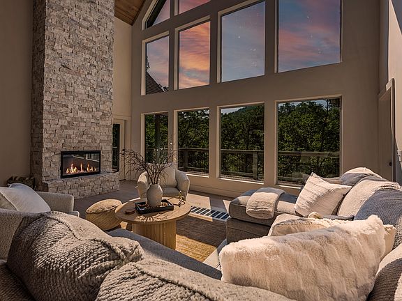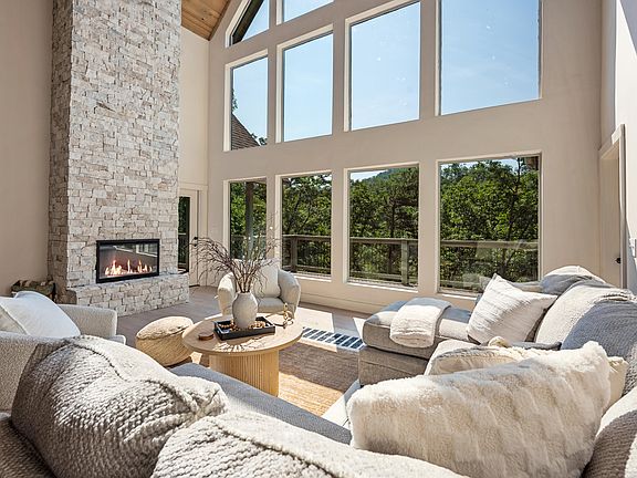 Stacked stone fireplaceOpen-concept layoutModern finishesWooded viewsSpacious dining area