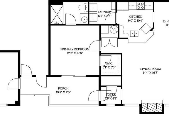 Appliances include fridge, oven/stove, dishwasher, microwave/range hood, washer, and dryer.