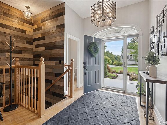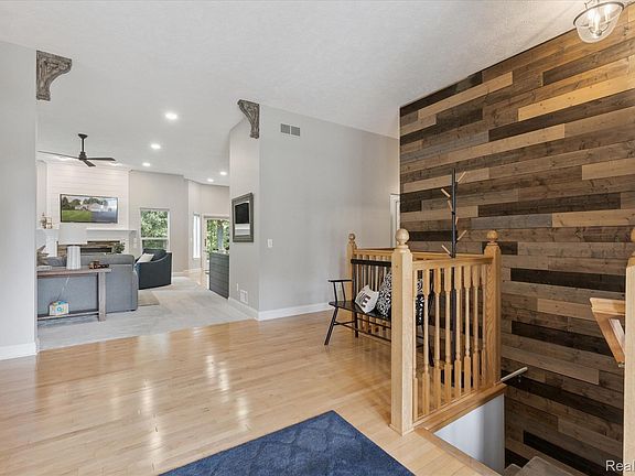 Stunning Split Ranch – Fully Updated & Move-In Ready! Striking foyer with wood accent wall welcomes you into this beautiful home featuring a great room with 10 foot vaulted ceiling, a gas fireplace with mantle, stone inlay, and shiplap accents. The eat-in kitchen offers granite countertops, stainless steel appliances, shiplap, snack bar, and a new sliding door (2025) leading to a stamped concrete patio with a Mary Grove retractable awning—perfect for enjoying your Beautifully landscaped backyard including dedicated play area that backs to a serene natural wooded area. The primary suite includes a double sink vanity, separate shower, and a renovated 100 square foot walk-in closet with skylights. You’ll love the laundry/mudroom with custom cabinets, soapstone counters, farm sink, new washer and dryer, storage for coats/shoes/backpacks, and sliding barn door. Major upgrades: New roof (2024), New high-efficiency furnace & AC (2025), Repaved driveway (2024), Fresh paint & carpet throughout, New zebra shades in every room, Fresh landscaping around the entire property plus 6-zone irrigation sprinklers and invisible fencing. The professionally finished lower level offers 2 additional bedrooms, a full bath, an office with French doors, a recreation area with custom wet bar and slate flooring—perfect for entertaining. Car enthusiasts will appreciate the spacious, insulated, and heated 3-car garage with new extensive cabinets/wall storage system, new garage doors (2023), and specialty high-lift tracks that can accommodate a vehicle lift.