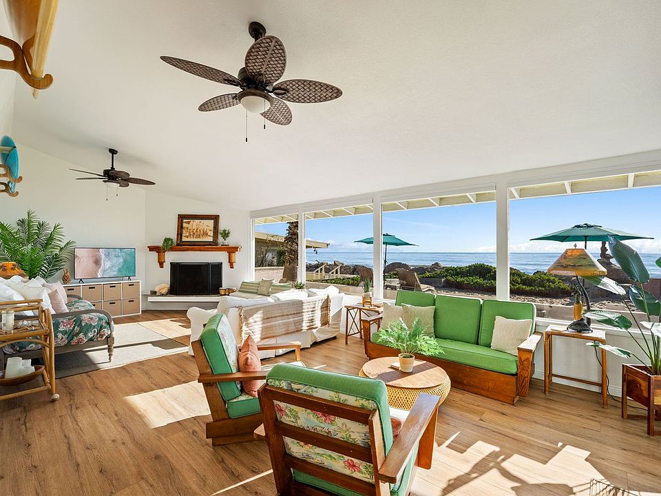 This Hawaiian Beach Style home features a fully furnished 2-bedroom, 2 bath cottage (sleeps 4). The main house includes a large primary bedroom (king bed) with a walk-in closet and newly remodeled ensuite bathroom. The kitchen, dining & living room boast ocean views with a welcoming and comfortable open floor plan. Enjoy relaxing in the living room that includes a large corner gas fireplace, perfect for keeping warm on colder nights all while taking in the panoramic ocean views!