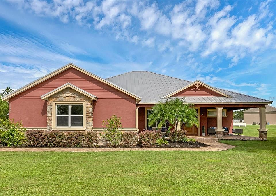 Move-in ready 2021 custom home on 1.6+ acres with hurricane-strong construction, standing seam metal roof, upgraded insulation, and energy-efficient windows. Features include fenced pasture for animals, irrigation system, deep private well, and water filtration. Enjoy a paver driveway, screened porch, and open floor plan with gas fireplace. The kitchen offers sealed marble counters and modern finishes. The spacious primary suite boasts abundant natural light, dual shower heads, a soaking tub, and a large walk-in closet. No HOA. A perfect blend of modern efficiency and country charm—ready for its next owner.