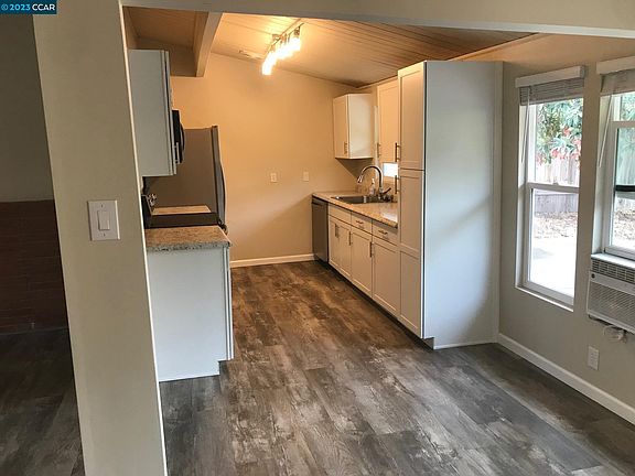 Mid Century one story home in quiet Glenbrook Heights neighborhood. House was renovated in 2020 with new kitchen (cabinets, counters, appliances, etc), new roof and gutters, new windows, new floor coverings, mini split unit in primary bedroom, and more. The high vaulted wood ceilings make all the rooms super spacious. Luxury vinyl plank flooring in open living area. Lots of natural light and cozy brick fireplace make the living room so inviting. Convenient location near BART, highways, downtown Concord, Todo Santos Plaza, schools and parks.