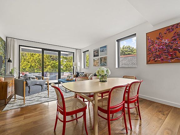 Upon transiting the long entry foyer, the corner great room offers separate living and dining areas with oversized windows on two sides, and seamlessly leads through the large sliding door to a spacious balcony with room to entertain many guests. The lush backdrop of Greenwood Cemetery is nearly close enough to touch, filtering and dappling sunlight through the home, and offering a front row seat to seasonal transitions. A delightful powder room and two closets adjoin these spaces.
