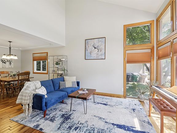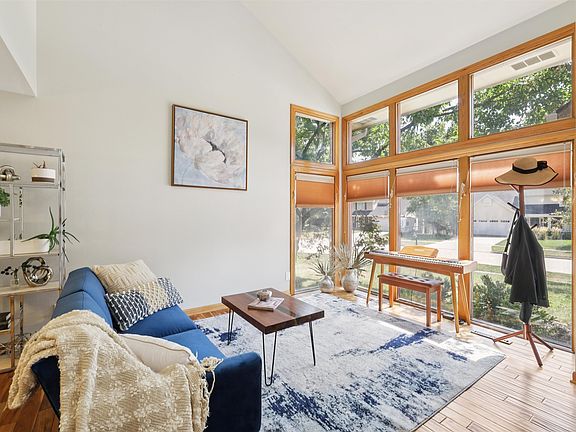 Welcome to this unique home with mid-century charm in an established WDSM neighborhood. The moment guests enter their eyes are drawn to the vaulted ceiling and floor to ceiling windows in the soaring front room, also featuring a grand staircase to the upper level, real hickory wood floors & an open floor plan. The rest of the main level does not disappoint, with a living room featuring a stone fireplace, formal dining w/ceiling tray, an updated kitchen w/white cabinets. Don't miss morning coffee in the sunroom!