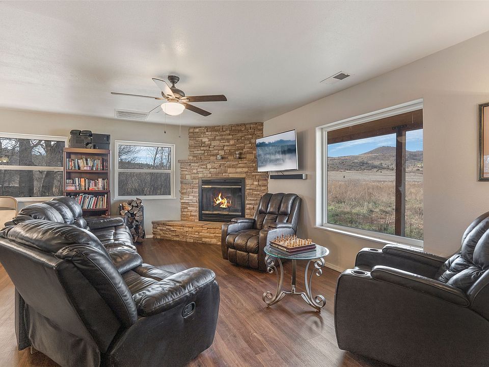 Discover the quiet beauty of Northern New Mexico at 305 County Road A1 in Sapello—a private, creekside retreat set on 5.38 acres with water rights and surrounding natural serenity. Built in 2015, this thoughtfully designed 1,512 sq ft single-level home offers an inviting blend of comfort and space, beginning with an open-concept living area anchored by a cozy fireplace and flowing seamlessly into a spacious kitchen and dining room. The floor plan provides excellent separation of space, with the primary suite on one side of the home—featuring a large double-vanity bath, separate shower, and soaking tub—while two guest bedrooms and a full bath sit privately on the opposite end. Tall windows invite warm natural light, and the home’s easy layout makes it ideal as a full-time residence or a peaceful weekend getaway.