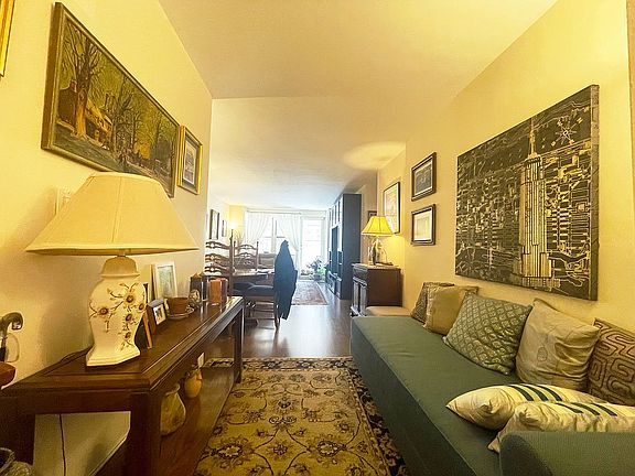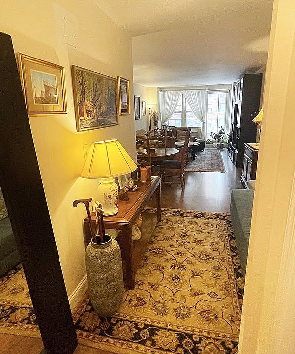 There is a very large and deep custom closet in the gracious entryway, and wood floors throughout, including modern track lighting, supplementing the apartment’s western facing natural sunlight.