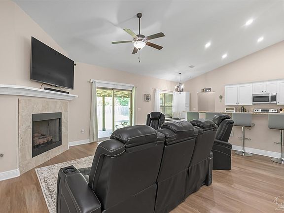 PRICE IMPROVEMENT!!!Welcome to this move-in ready 4-bedroom, 2-bath home in the heart of Cantonment with NO HOA! Built in 2015, this all-brick home features fresh interior paint, updated exterior lighting, and a layout designed for modern living. The living room boasts cathedral ceilings, luxury vinyl plank flooring, a gas fireplace, and sliding doors that lead to a covered patio. The kitchen includes granite countertops, stainless appliances, pantry, and a breakfast bar that opens to the main living space. The primary suite offers a tray ceiling, walk-in closet, dual granite vanity, garden tub, and tiled walk-in shower. The backyard is privacy-fenced with gutters, a yard building, and space to entertain or unwind. Located on a 0.32-acre lot minutes from Navy Federal, schools, and shopping. Eligible VA buyers may have the opportunity to assume a 2.75% VA loan—ask for details! Investor-friendly and short-term rental eligible.