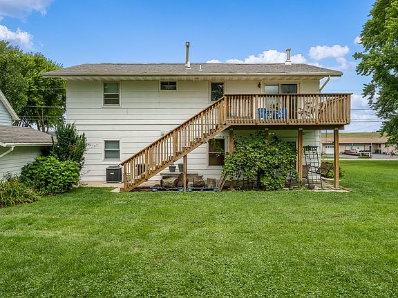 Great home located in the heart of Durand. Within walking distance to the cozy downtown area. This home features a lot of living space. Upper level consists of living room area with wood burning stove, vinyl flooring, ceiling fan, and open to charming kitchen and dining area. Sliders off of dining area that access upper wooden deck. 3 bedrooms and full bath complete this upper space. Lower space consists of family room area with gas log fireplace, wet bar, built-ins and full walk out that leads to brick paved patio. Additional bedroom and full bath complete the area. One car attached garage, detached storage shed, large yard and fire pit for entertaining. Well cared for home.
