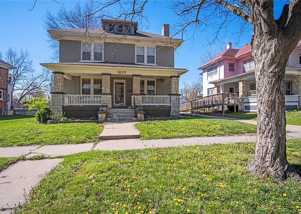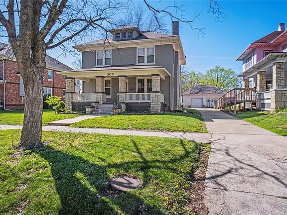 Welcome to this charming 1930 Victorian-style home located near the historic square of Paola, Kansas. As you step inside, you'll be greeted by the warmth of original hardwood floors that span most of the home. The original woodwork adds character and charm, while the stained glass windows, sourced from an 1870's church, illuminate the large great room, complete with a leaded glass built-in China cabinet.